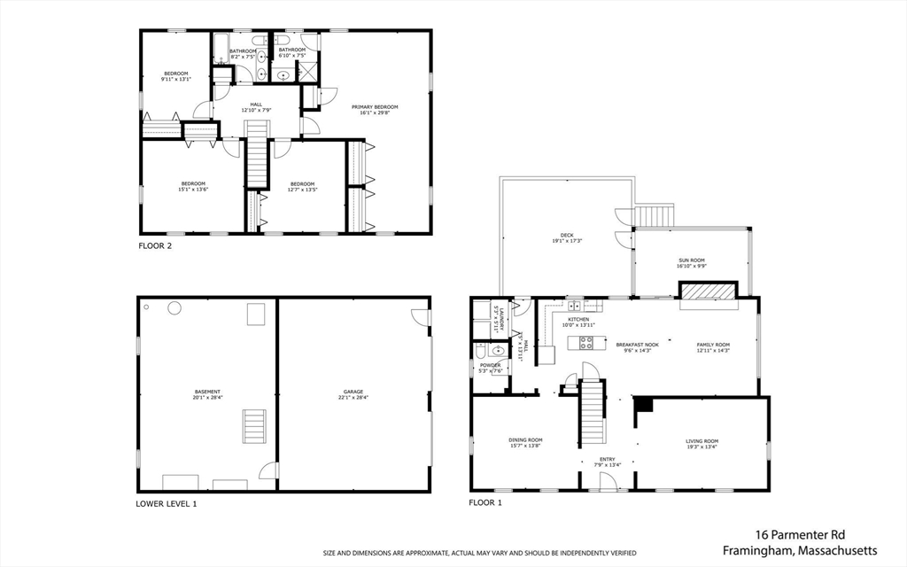 Welcome to 16 Parmenter Rd - an inviting center-entrance Colonial nestled on a lush 1-acre lot with mature landscaping & fruit trees. The thoughtfully designed interior boasts 2760 sqft of living space with 4 beds & 2.5 baths. Upon entering, you're greeted by a formal living room & dining room, ideal for entertaining. The family room opens to a welcoming kitchen w/ ample cabinetry, chef's island, & direct access to a sunroom & deck, providing a seamless transition to the tranquil & level backyard. The main floor includes a convenient half bath & laundry room. The second level features a large primary bedroom w/ ensuite bath & 3 additional bedrooms with a full bath. The unfinished basement provides ample storage & access to the 2-car attached garage, equipped w/ increased amperage outlet for your EV charger. Potential to finish the basement for additional living space. This property caters to every lifestyle, don't miss the chance to make this your forever home.