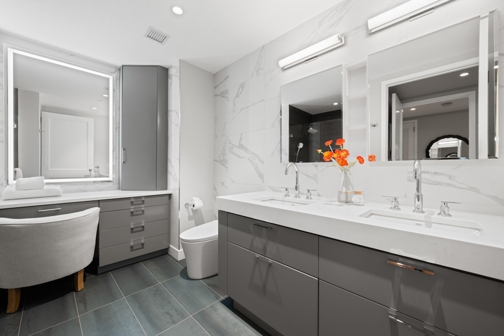 Experience waterfront luxury in this exclusive 7th-floor G residence at Pier 4, boasting dual exposures of Boston Harbor and Seaport Marina with 2 private balconies. This 2,261 SF home offers 3 bedrooms each with water views, dedicated den/office, 3.5 baths, large laundry room, 2 side-by-side garage spaces with EV charging & storage. The spacious layout features a gracious living room with custom shelving and fireplace, elegant dining area with chandelier, and balcony with striking marina and city views. The gourmet kitchen has two-toned cabinetry, quartz waterfall island, Gaggenau appliances, wine fridge, & gas cooking. The primary suite with built-ins includes 2 California Closets, renovated ensuite bath with glass shower, & balcony with harbor views. Two additional bedrooms with ensuite baths, dedicated den/office, & half bath complete this stunning home. Full-service luxury living with 24/7 concierge, valet, gym, yoga studio, golf simulator, dog spa, lounge, BBQ area & terrace.