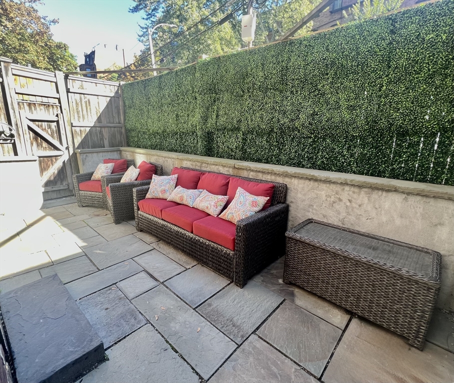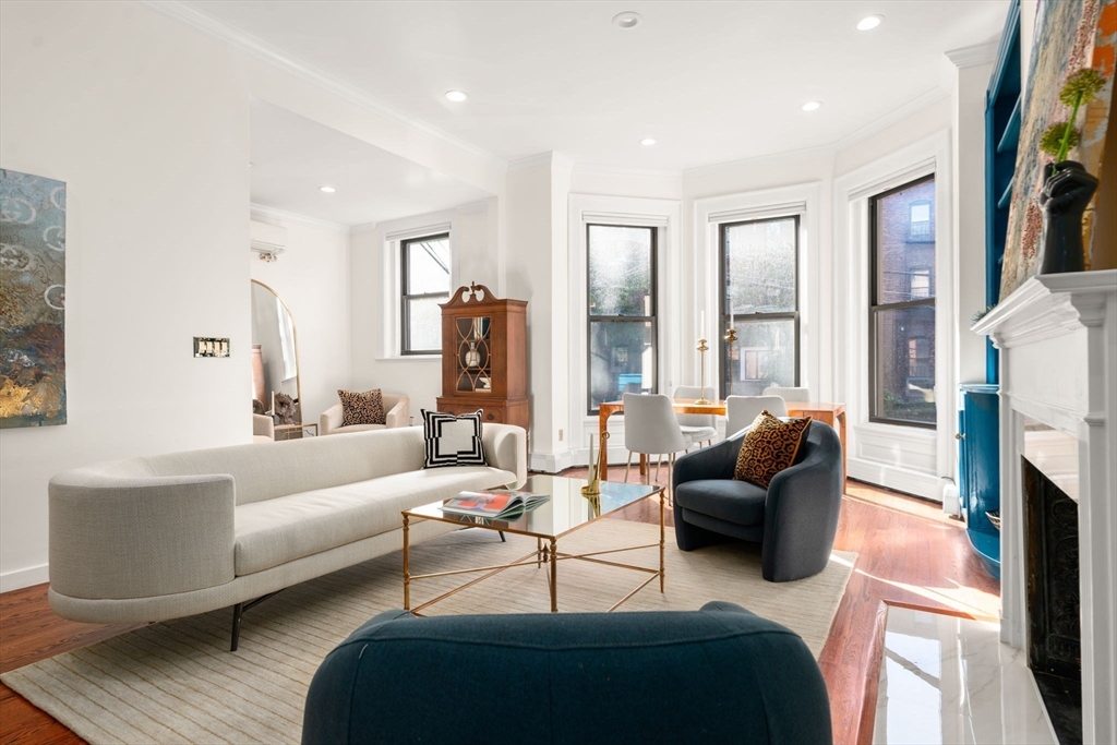 457 Beacon St, Residence 5 is an elegantly updated duplex condo with two levels of living, generous primary bedroom, two renovated full baths, AC, private backyard, and one transferable parking space. Inside a quintessential Back Bay brownstone, this parlor level home opens into a gracious foyer bathed in color, setting the tone for elegant interiors and finishes. The 11-foot-ceilings and oversized bay windows welcome abundant light into the living and dining rooms with hardwood floors, built-ins, and marble fireplace. New appliances highlight the eat-in kitchen with extensive cabinet storage. A fully-updated bath rounds out the main level. The lower level offers both a large bedroom with three sizable closets and full windows facing the private, fenced-in backyard plus additional office space and second renovated full bath. Low condo fee includes heat, hot water. Recent HOA updates include new sewer pipe, roof improvements. Located minutes from Newbury, Hynes T, Pru, MIT, BU, Fenway.