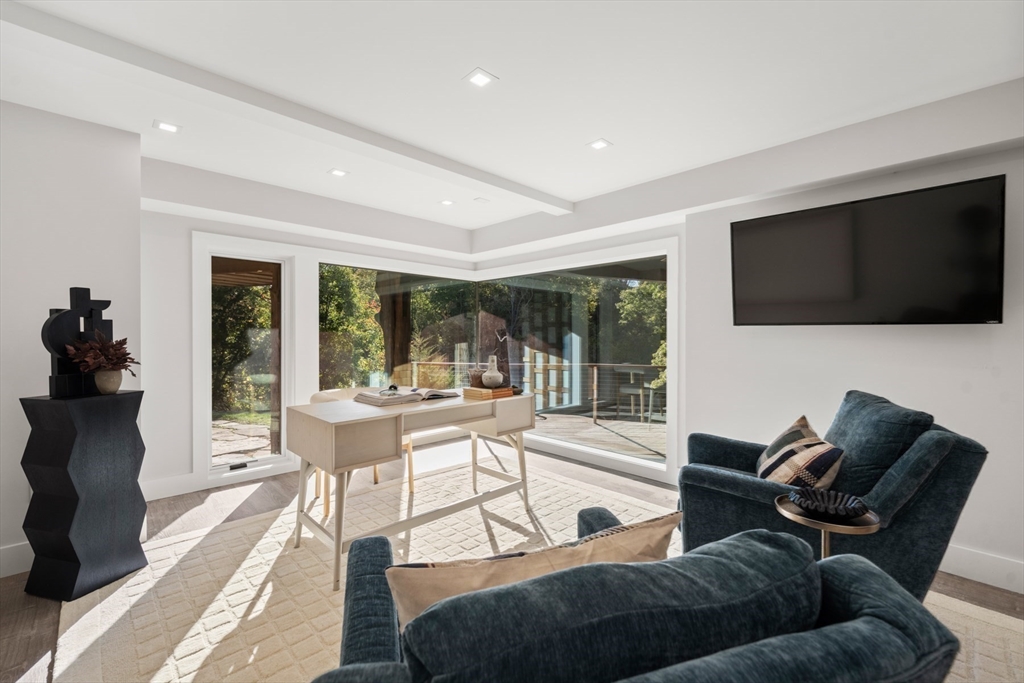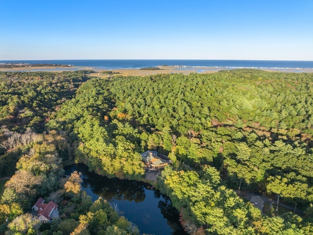 Welcome to The Treehouse at Wales Pond -- a breathtaking 8,000+ SF custom-built sustainable retreat, privately set on 2.83 acres along the water's edge. This architectural masterpiece fuses Japanese and Spanish influences with organic materials and pond views from nearly every room. Expansive glass walls open to sun-drenched terraces, effortlessly merging indoor and outdoor living. Every space embodies intentional design from the vaulted great room with custom steel fireplace and floating staircase, 1st floor primary suite with Smart Glass solarium bath, and tranquil Yoga Studio with Tatami mats. This home offers 4-6 bedrooms, 6 full baths, a spacious media room, lofted library, and a full in-law suite on the lower level with private entrance. Outdoors, a heated pool & jacuzzi, yard, fire pit & pizza oven overlook Wales Pond, while private trails through abutting conservation land lead to the Village of Marshfield Hills. A true sanctuary ideally located minutes to the Atlantic Coast.