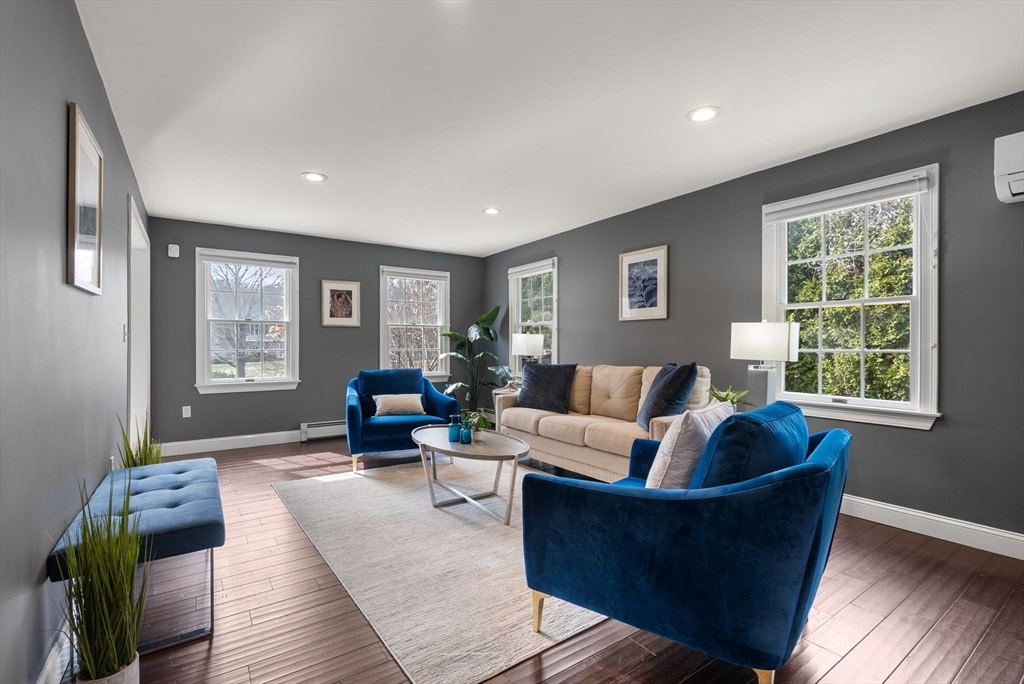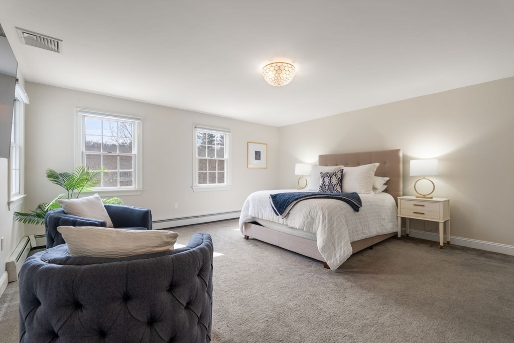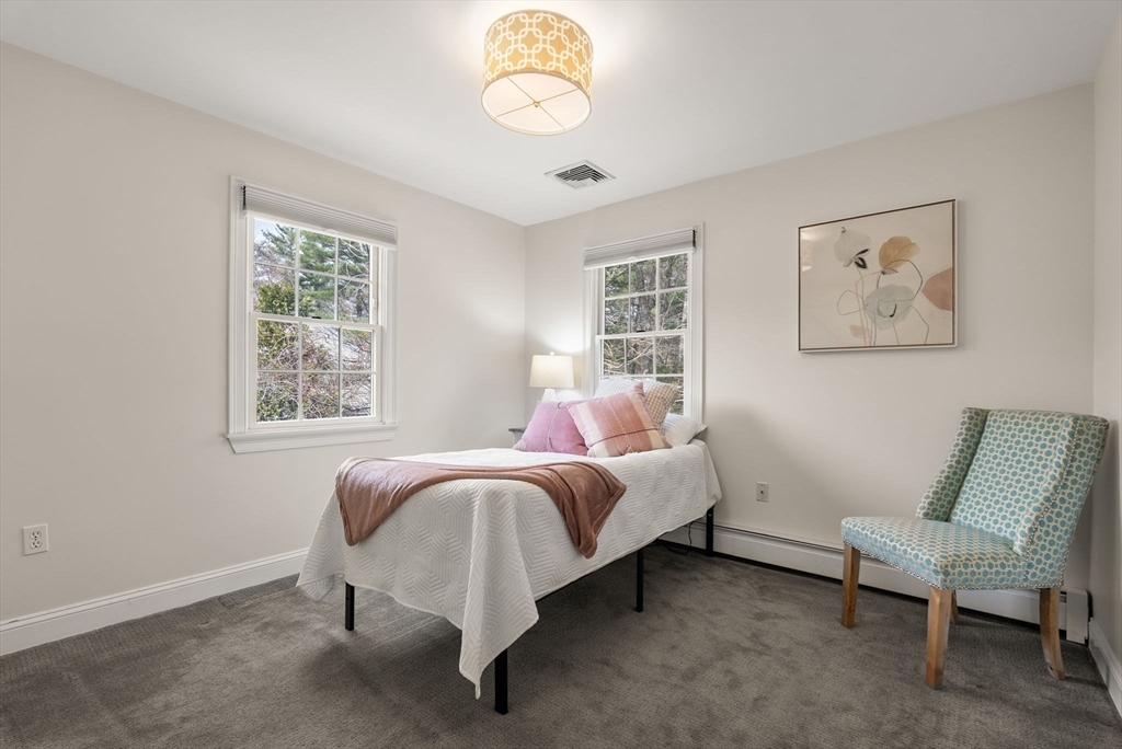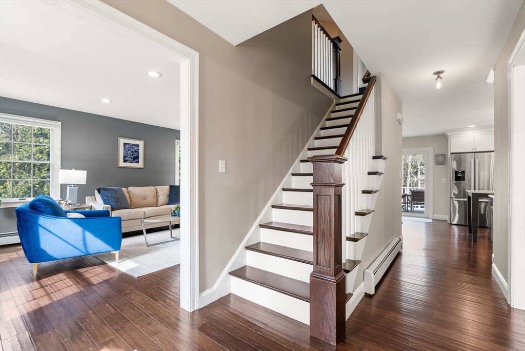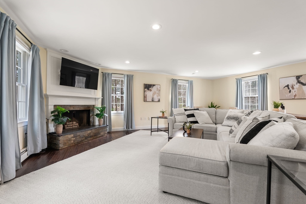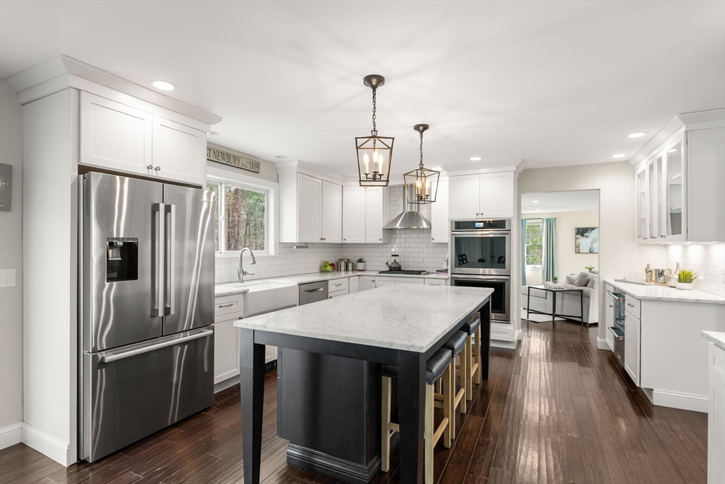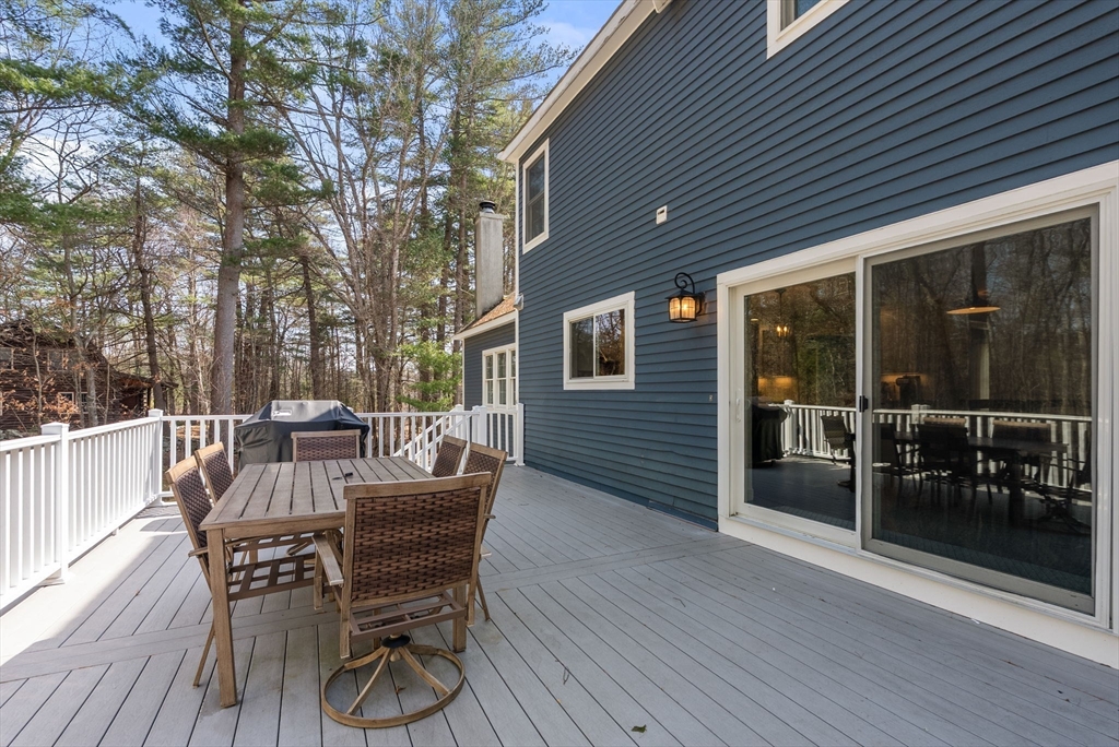 5 Captain Pierce is a beautifully updated Colonial with four finished levels of living on an acre of land, situated in a quiet cul-de-sac in desirable West Newbury north of Boston. The gourmet eat-in kitchen features marble countertops and gas cooking with attached deck for outdoor dining. An inviting living room centers around a stacked stone fireplace, creating a warm ambiance that flows into formal dining room and cozy den. Upstairs the primary suite features an expansive walk-in closet with custom built-ins storage and luxurious spa ensuite bath. Two generously-sized bedrooms, a second full bath, and laundry room provide comfort and practicality. A third-floor retreat offers versatility as an office, guest room, or fourth bedroom. The finished lower level is a large family room with mudroom for direct access to the two-car attached garage. Outside is a large, level yard surrounded by mature landscaping. Close proximity to hiking, boating, and major highways for commuters.